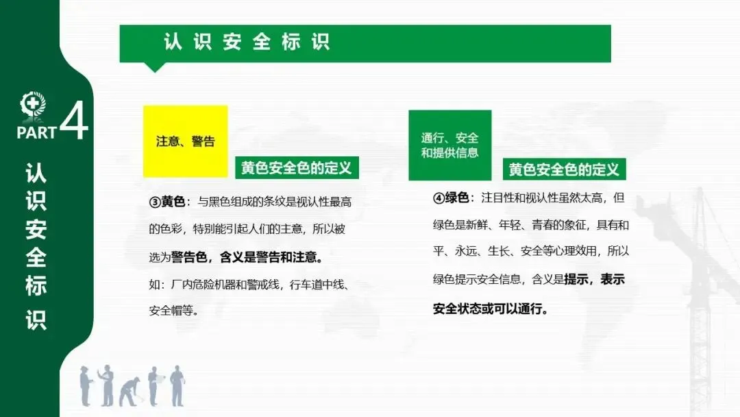- 详细说明了我国规定的四种安全色及其含义:红色(禁止/停止)、黄色(警告/注意)、蓝色(指令/必须遵守)、绿色(提示/安全通行)。