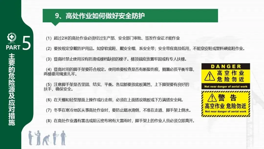 - 特别强调了高处作业(2米以上)的审批、防护用品穿戴及安全带“高挂低用”等要求。