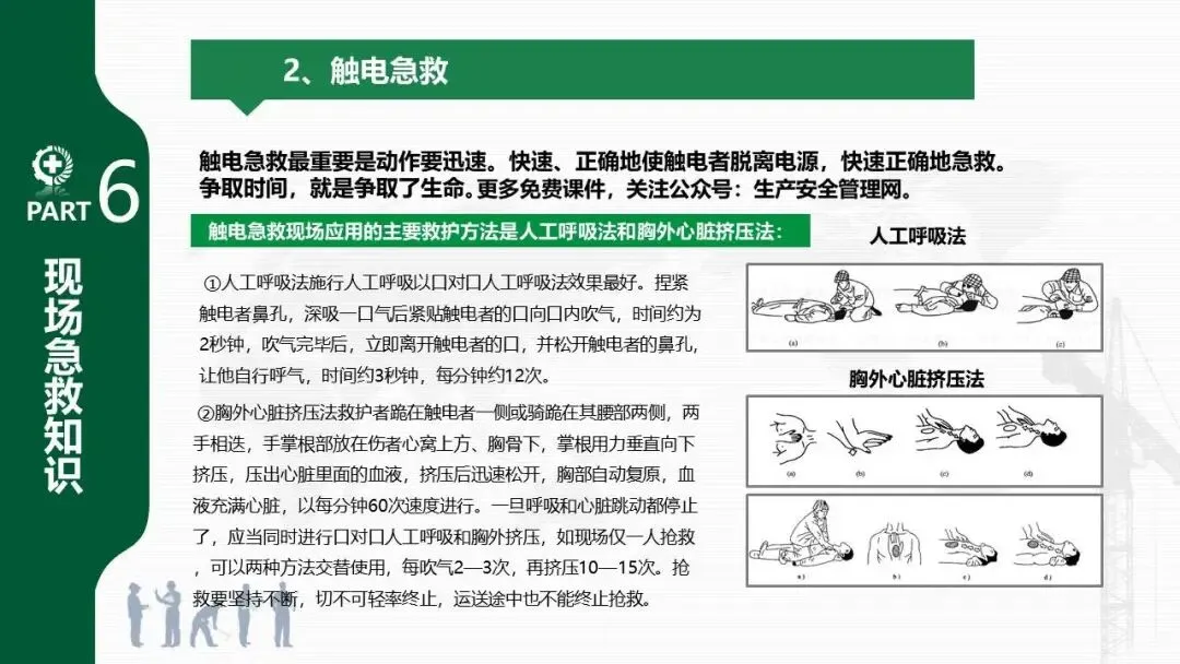 - 重点详解了触电急救的人工呼吸法和胸外心脏挤压法的操作步骤与要点。