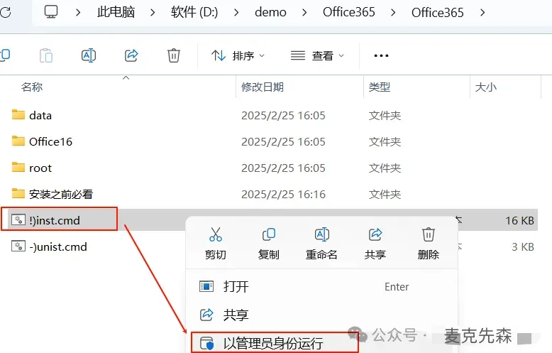 1.将下载好的压缩包解压,然后选中“❗)inst.cmd”鼠标右键以管理员身份运行。