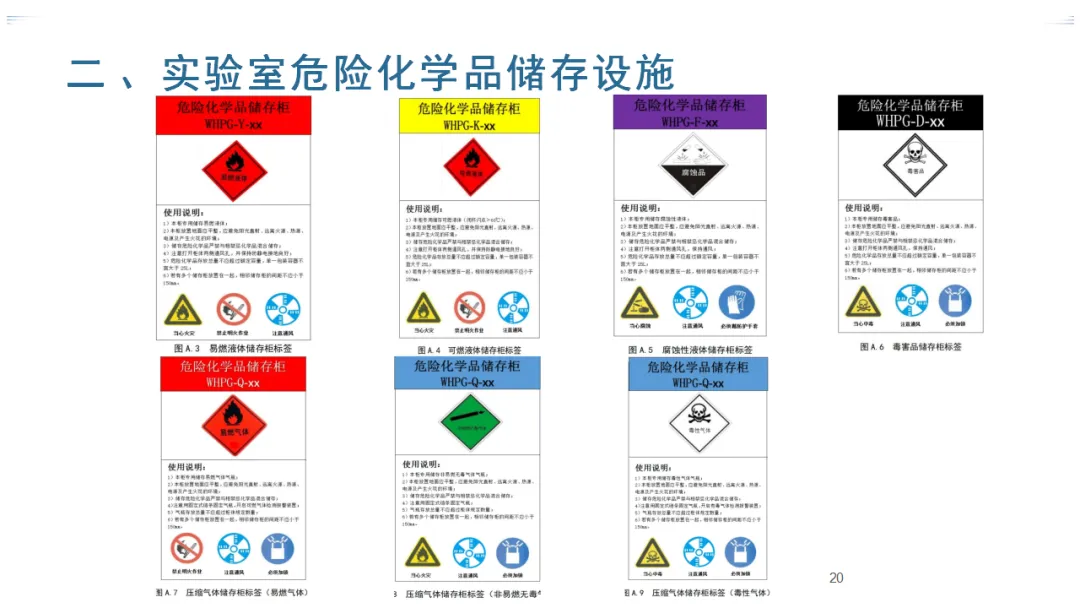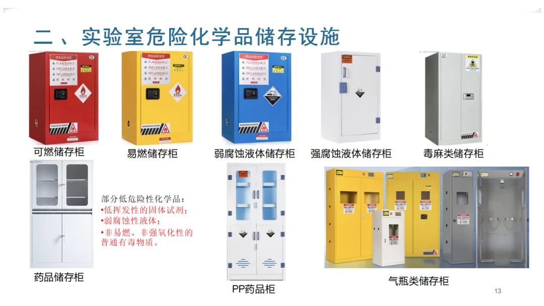 实验室危险化学品储存设施主要包括各类专用储存柜,根据储存物质的性质不同,分为: