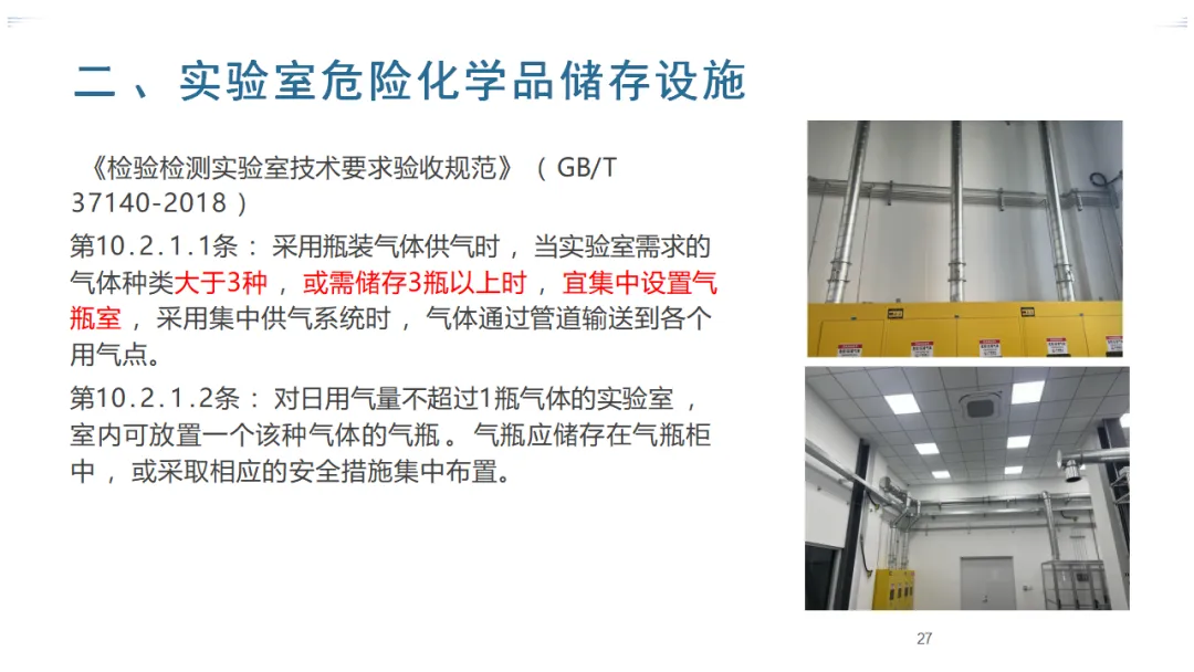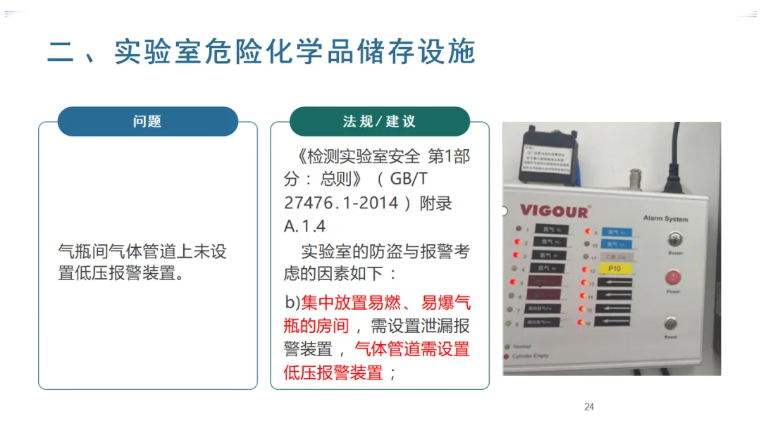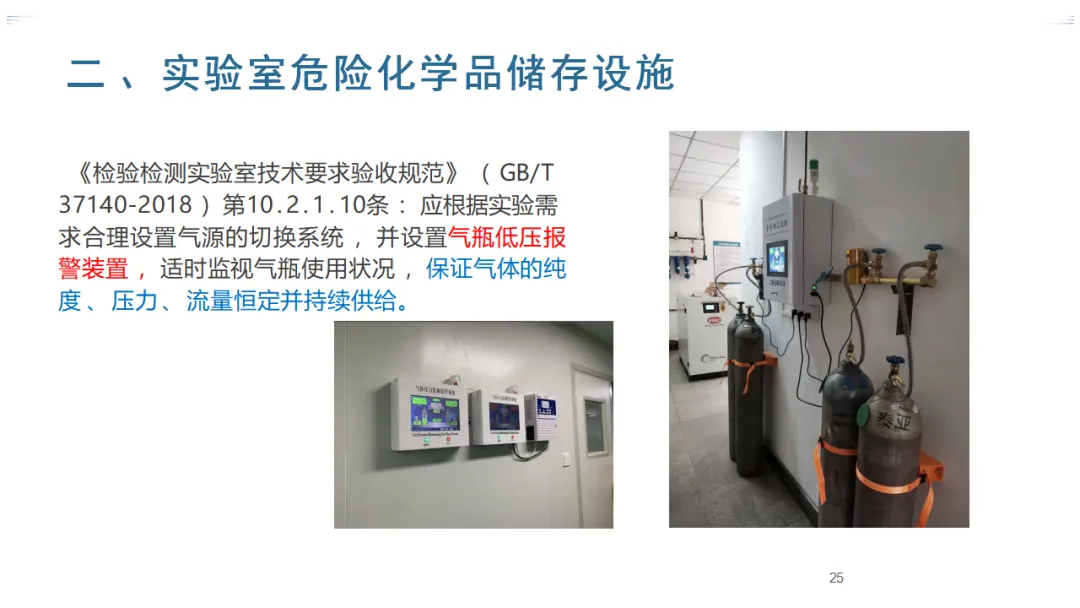 《检验检测实验室技术要求验收规范》(GB/T 37140-2018)第10.2.1.10条:应根据实验需求合理设置气源的切换系统,并设置气瓶低压报警装置,适时监视气瓶使用状况,保证气体的纯度、压力、流量恒定并持续供给。