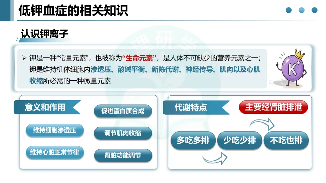 钾离子的生理功能:钾是人体必需的“生命元素”,维持细胞内渗透压、酸碱平衡、新陈代谢、神经传导、肌肉收缩及心肌功能。