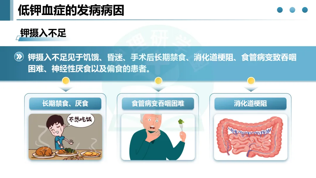 钾摄入不足:饥饿、昏迷、术后长期禁食❎、消化道梗阻、吞咽困难、神经性厌食、偏食等。