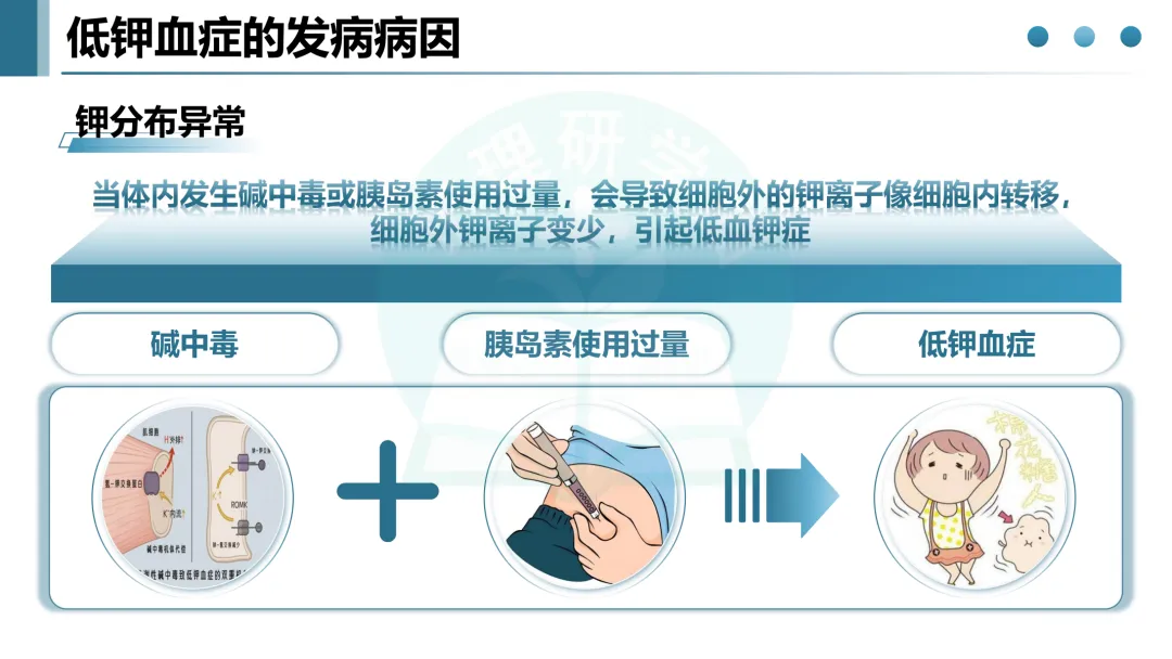 钾分布异常:碱中毒、胰岛素使用过量→细胞外钾向细胞内转移→血钾降低。
