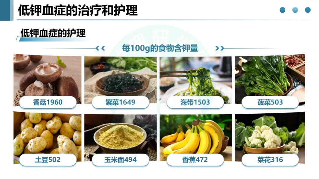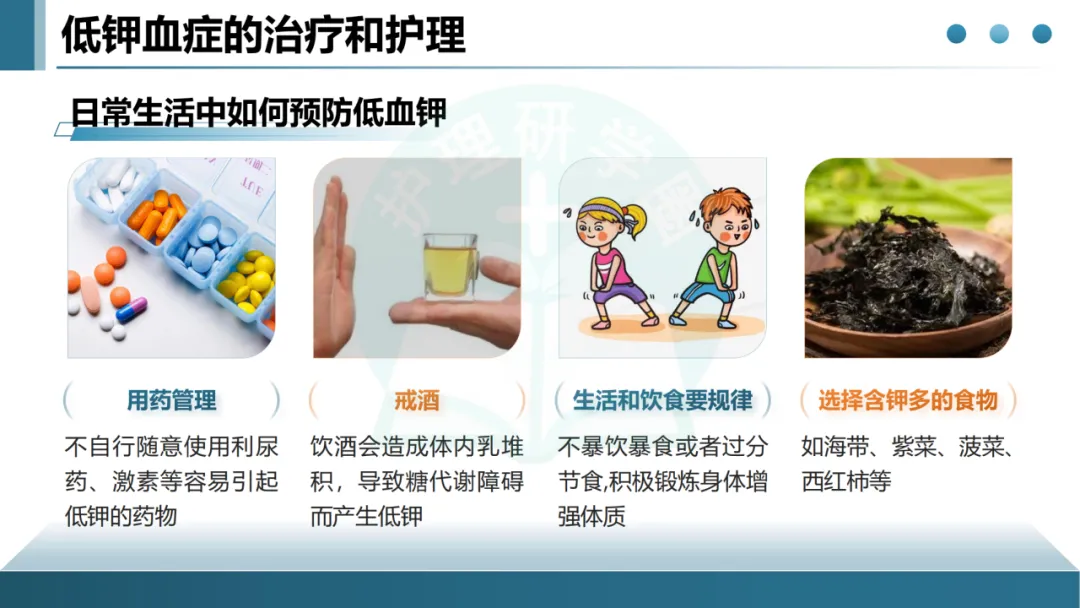 日常预防:用药管理不随意使用利尿剂、激素等致低钾药物。戒酒饮酒可致糖代谢障碍、乳酸堆积→低钾。规律生活避免❎暴饮暴食或过度节食,适度锻炼。饮食选择🥗多摄入海带、紫菜、菠菜、西红柿🍅等高钾食物。