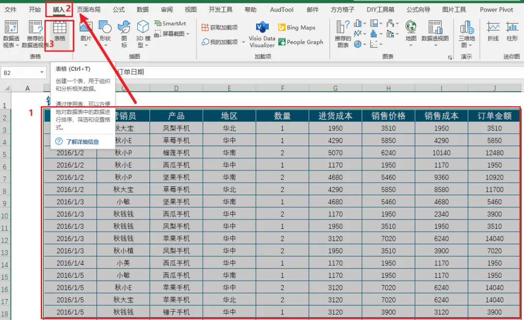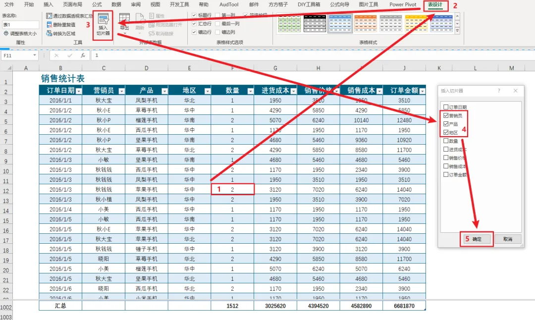 鼠标单击表格任意区域,在【表设计】选项卡中点击【插入切片器】功能,在弹出的对话框中勾选需要筛选的关键字段,比如:营销员、产品、地区,点击【确定】。
