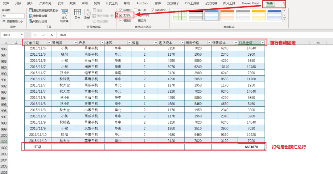 ❸ 超级表格:固定首行到标题栏;添加汇总行