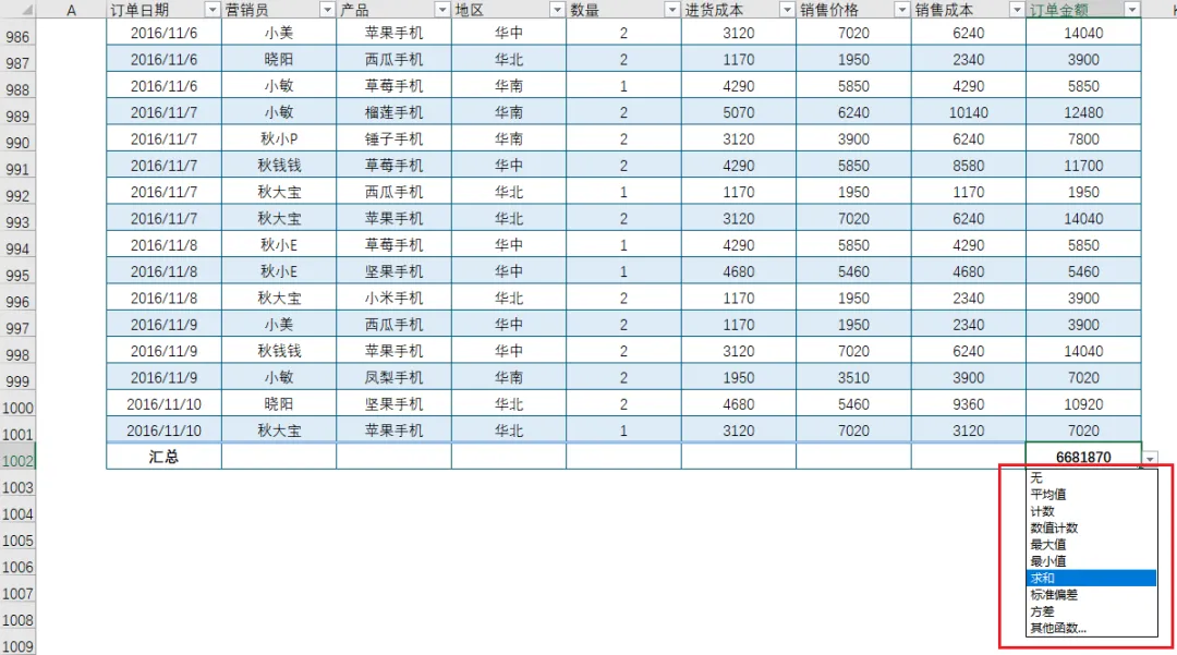 汇总行除了能够求和以外,还提供了求平均值、计数、最大值、最小值等统计计算功能,非常方便。