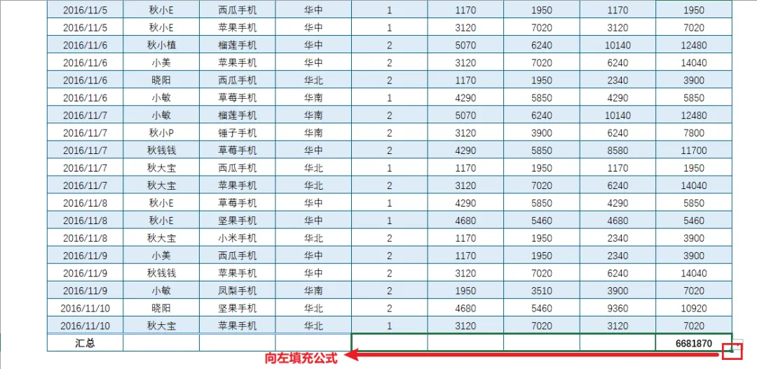 把鼠标移动到汇总单元格右下角,向左填充公式,还可以实现其他列的数据统计哦!