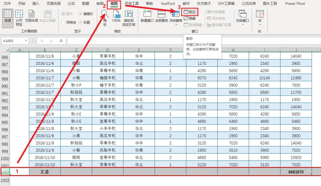 鼠标选中最下方的汇总行,点击【视图】选项卡中的【拆分】按钮,表格就被一分为二了。