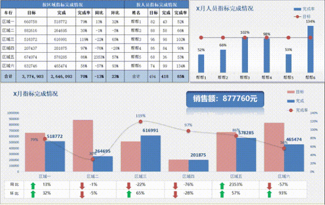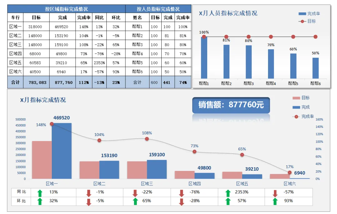 底部图表以柱图折线组合呈现各区域的目标、完成额与完成率趋势,支持统计记录同比环比数据,可以清晰揭示业绩波动,支持深度趋势分析。