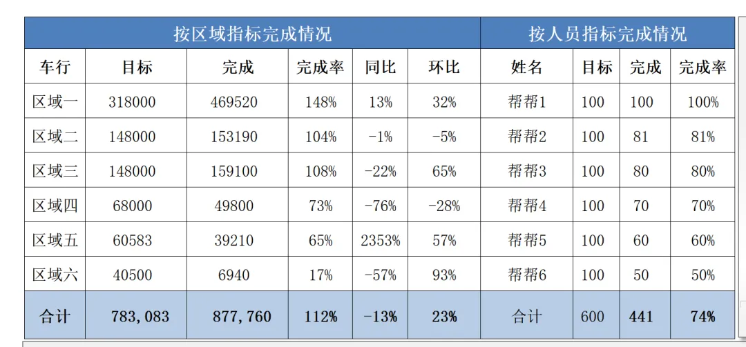 在表格中录入各区域的销售目标、完成额与同比环比数据,系统会自动计算完成率,并汇总总目标与总完成额,支持多区域业绩的横向对比。