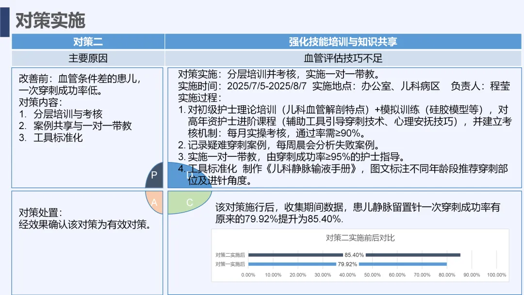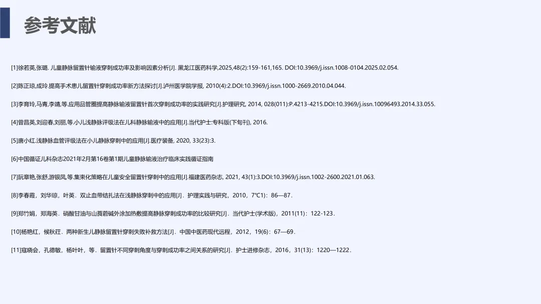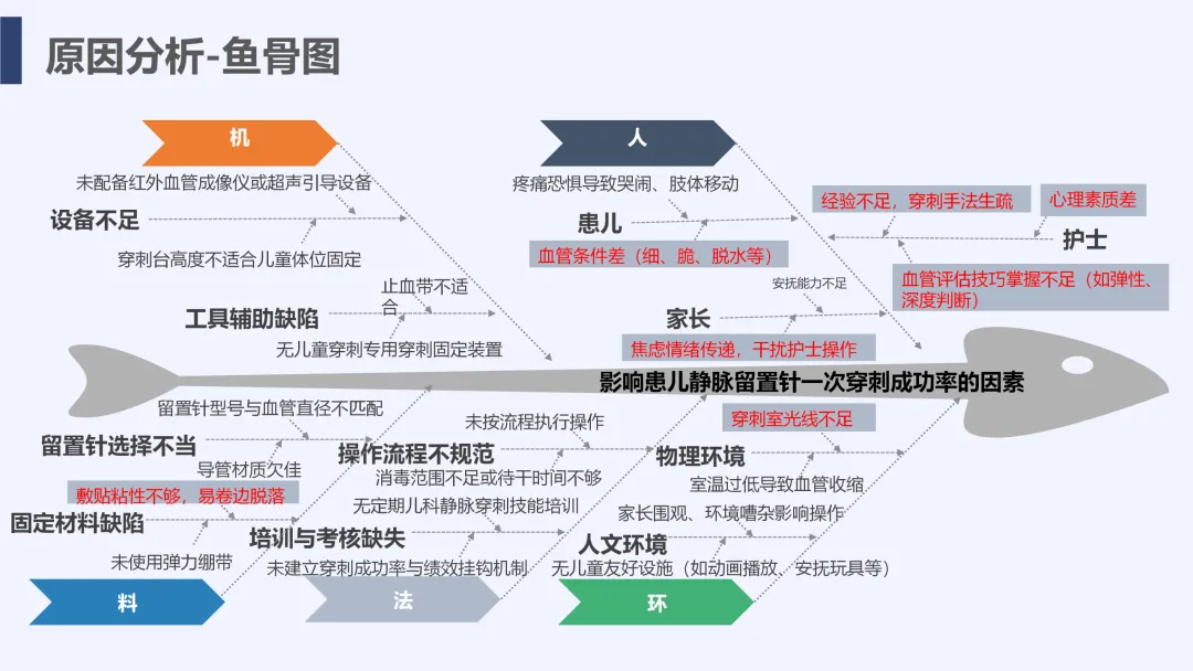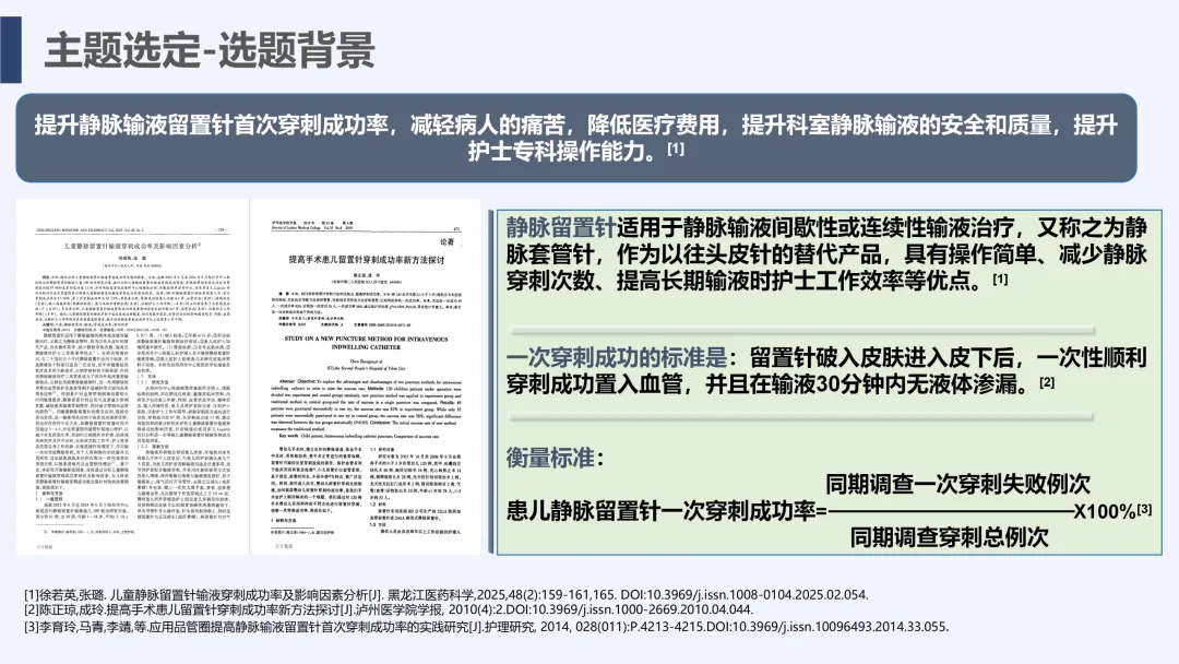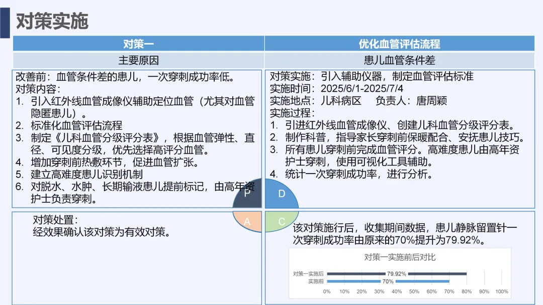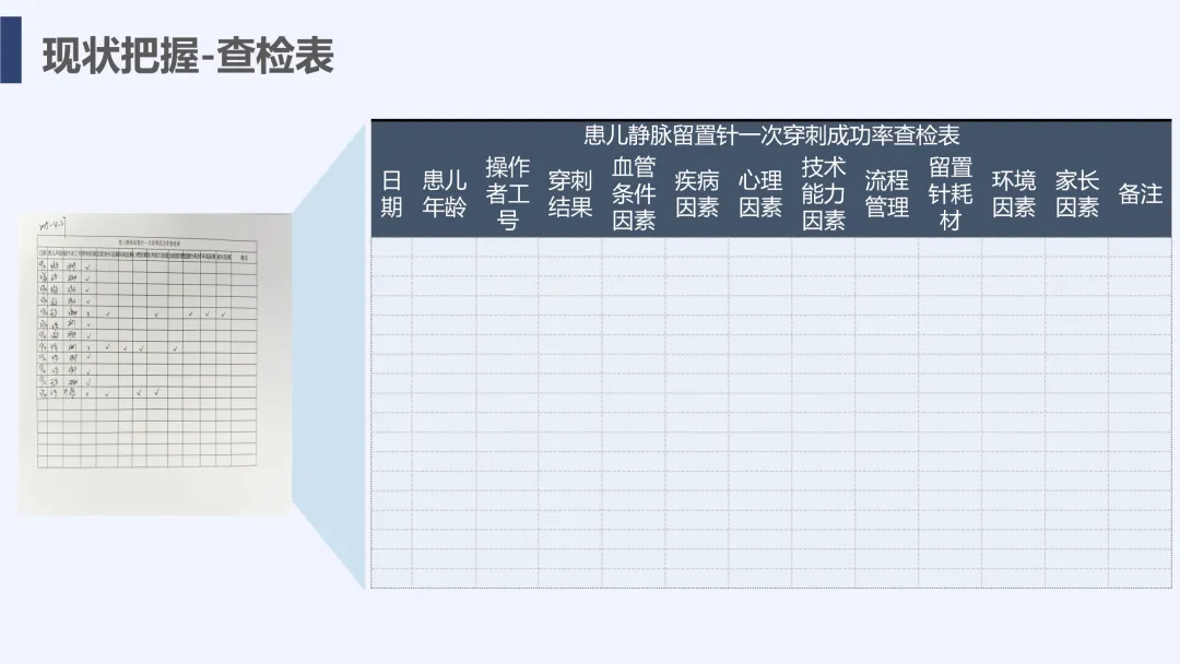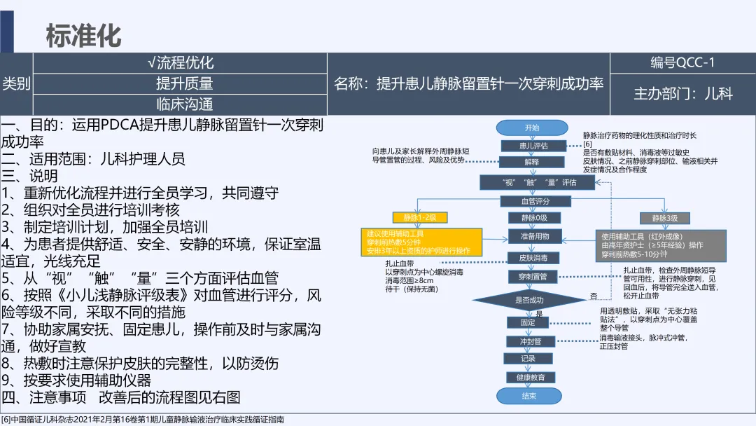 静脉输液是儿科临床常用治疗手段,静脉留置针因能减少反复穿刺痛苦被广泛应用,但临床中穿刺一次成功率偏低的问题较为突出,不仅增加患儿痛苦、易引发家属不满,也影响护理工作效率与质量。为改善这一现状,我院儿科团队运用PDCA循环管理方法开展专项质量改进工作,通过选题评价、现状查检明确核心问题,经原因分析与真因验证制定针对性对策并落地实施,最终有效提升了患儿静脉留置针一次穿刺成功率,形成标准化操作流程,为儿科静脉护理实操提供了切实可行的优化方案,同时也提升了护理团队专业能力与服务质量。