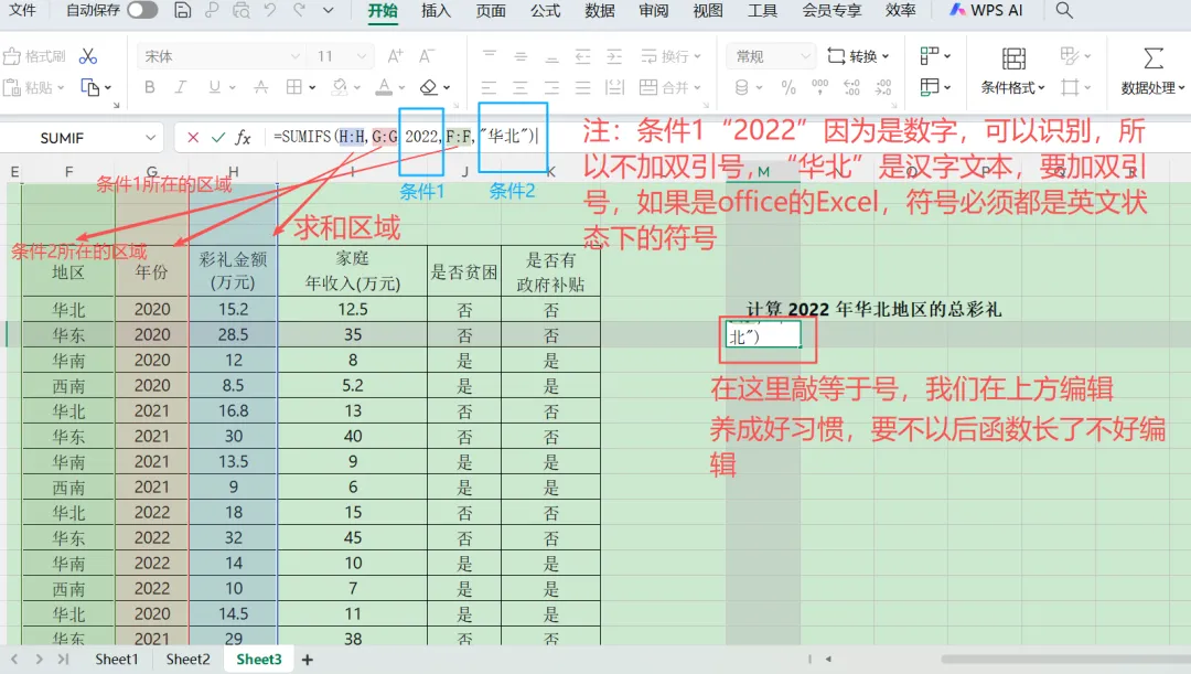=SUMIFS(H:H,G:G,2022,F:F,"华北")