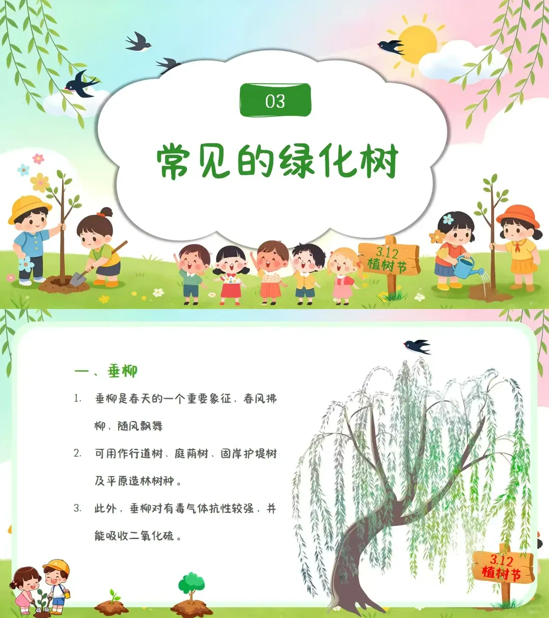 ✅植树4大好处:保水土、挡风沙、清污染、吸烟尘 ✅4种常见绿化树:垂柳、紫薇、银杏、柏树