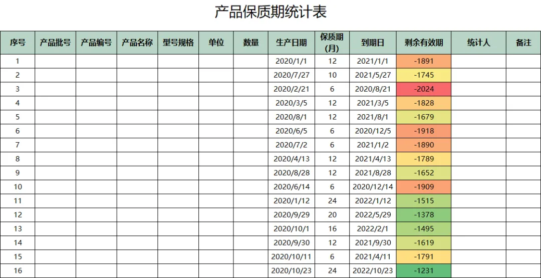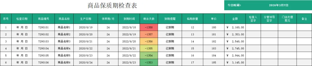 这里整理了4套Excel保质期统计表模板,填好商品名称、生产日期和保质期,到期时间自动计算,临期自动提醒,数据还能自动汇总。门店日常检查保质期,直接填、直接看,一张表就够了!