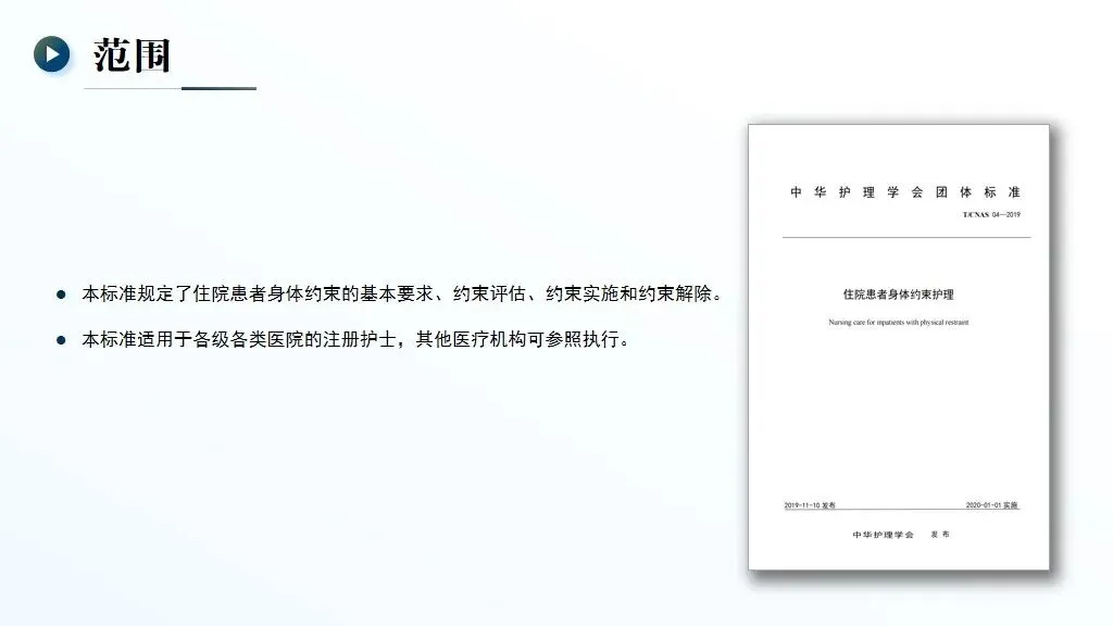 当前位置:首页>PPT>【PPT】住院患者身体约束护理——中华护理学会团体标准 T/CNAS 04—2019 解读
