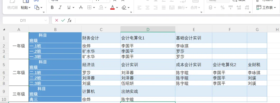current_subjects - 遇到含"班"字或"高三"的行 → 按列位置将教师姓名与