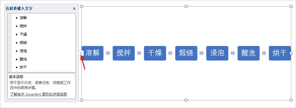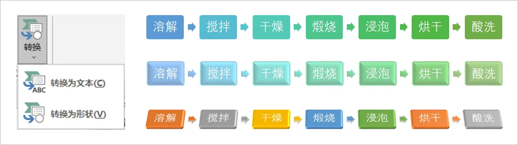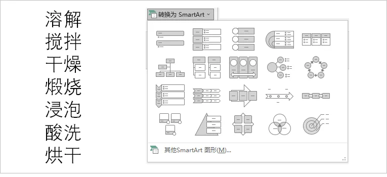 在文本框中对各个流程分行输入,选择文本框点击开始-转换为SmartArt,选择所需工艺图类型。