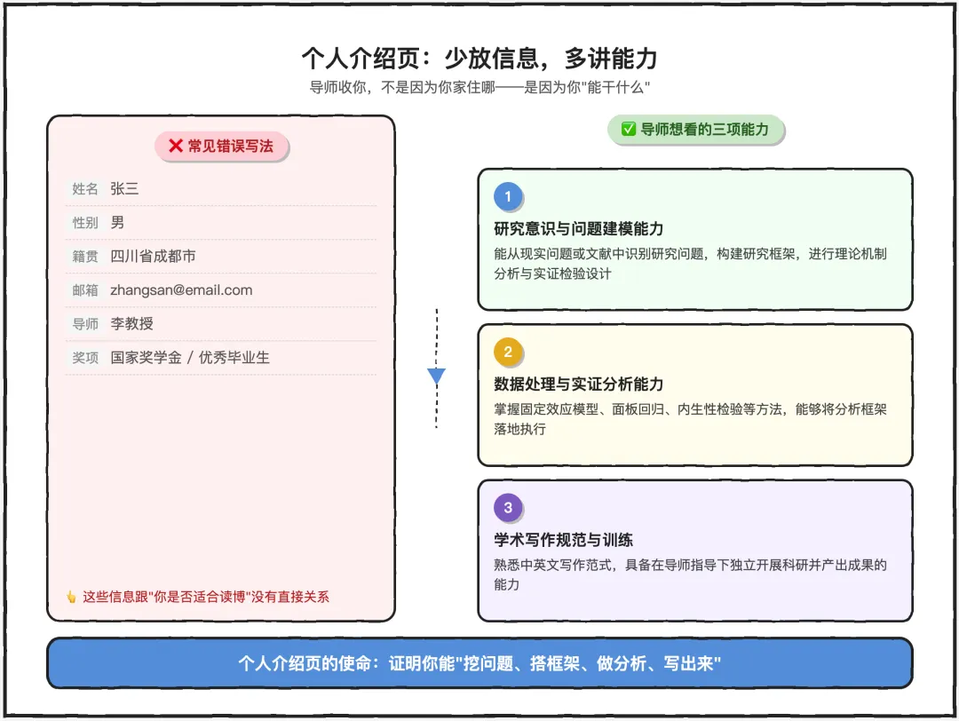 很多同学的个人介绍页,放了姓名、性别、籍贯、邮箱、导师是谁、获过什么奖……信息很全,但问题是:这些东西跟导师招你有什么关系?