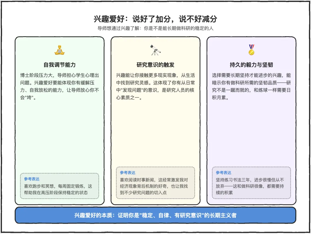 说白了,导师要的是这样一个人:能够独立挖掘问题、能够潜心做研究有持久的毅力、遇到压力能自我解决。你的兴趣爱好要能体现这三点。