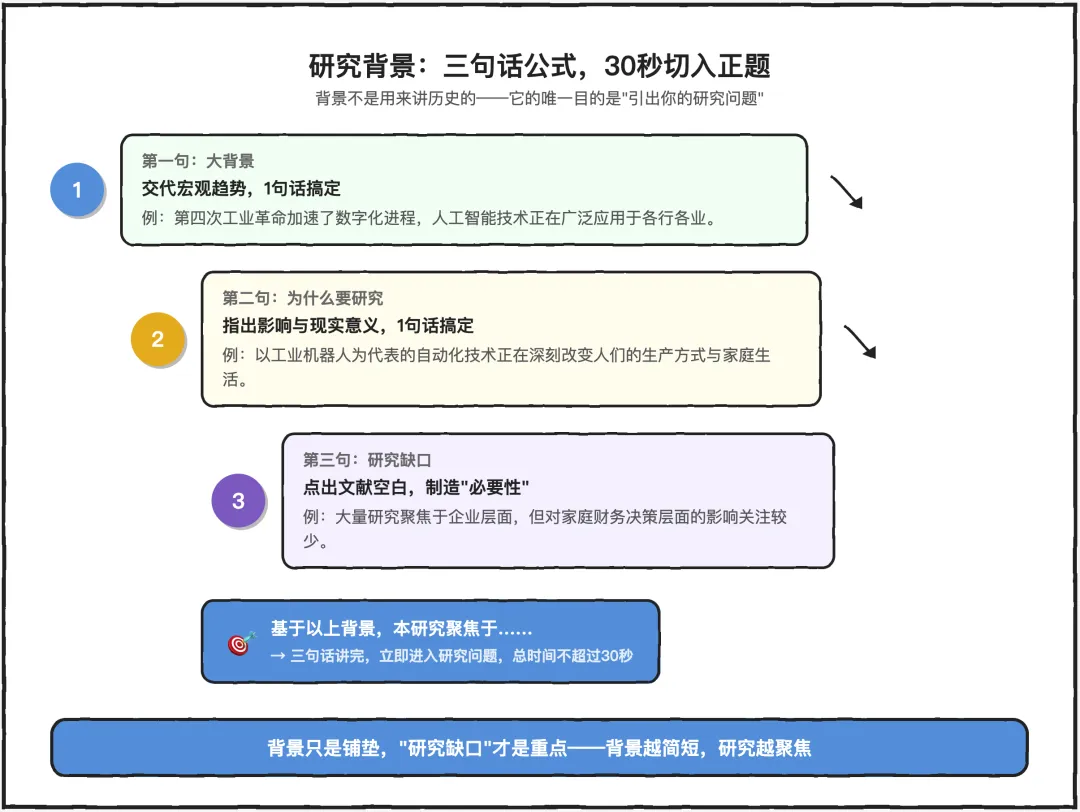 我见过有同学,七分钟的汇报时间,花了一分半钟还在讲研究背景,什么数字化时代发展、人工智能广泛应用、第一次工业革命机器替人……讲了半天,别人还不知道你要研究什么。