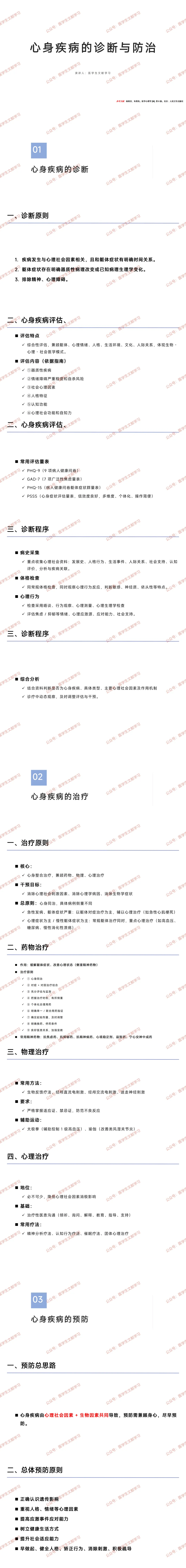 - 常用评估量表:PHQ-9(9 项病人健康问卷)、GAD-7(7 项广泛性焦虑量表)、PHQ-15(病人健康问卷躯体症状群量表)、PSSS(心身症状评估量表,信效度良好、多维度、个体化、操作简便)。