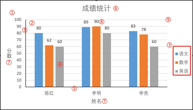 ①:图表区;②:绘图区;③:图例;④:数据系列;⑤:坐标轴;⑥:图表标签;⑦:坐标轴标题;⑧:数据标签;⑨:网格线- 图例:③处所示,是一个方框,用于标识当前图表中各数据系列代表的意义,由图例项和图例项标识组成。