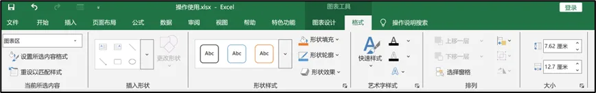 - 格式选项卡:从外观上编辑部分图表:改变图表大小、编辑部分形状样式。【注意】可以在开始选项卡对图表标题等文字进行字体、字号的设置。