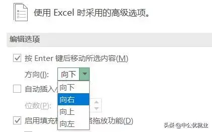 可是,Excel里,默认实现“Tab”键功能的,却是“Enter”键,这样就很不符合我们的操作思路,所以我们需要做一下设置,把Enter键方向设置成向右比较合适: