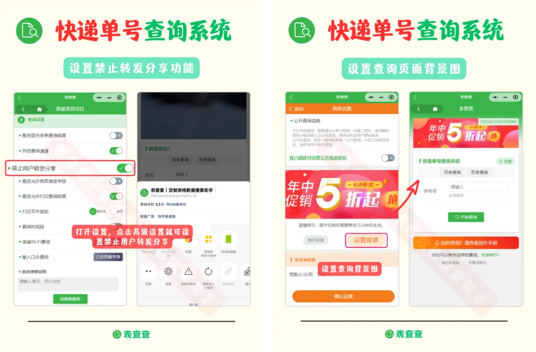 设置是否允许转发分享、是否支持 PDF 下载,并可上传查询页面背景图。