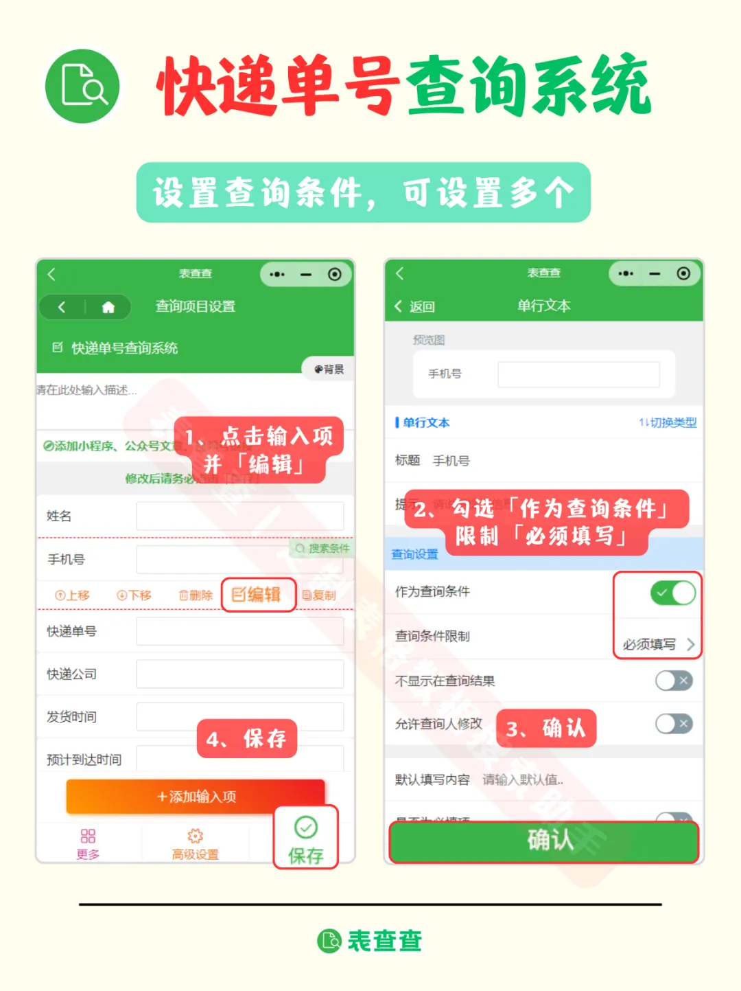 将快递单号或客户姓名设为“必填”或“模糊查询”,保证查询准确。