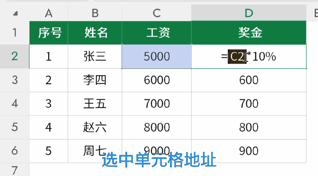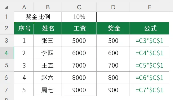 还是计算员工奖金,奖金比例10%固定在C1单元格。