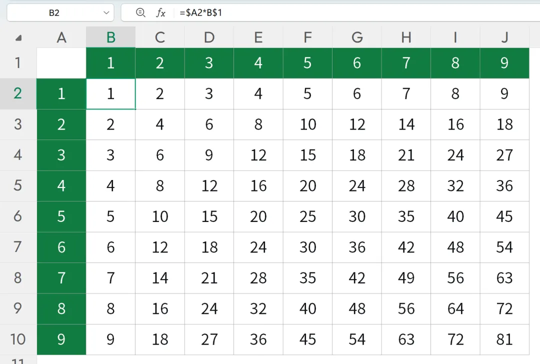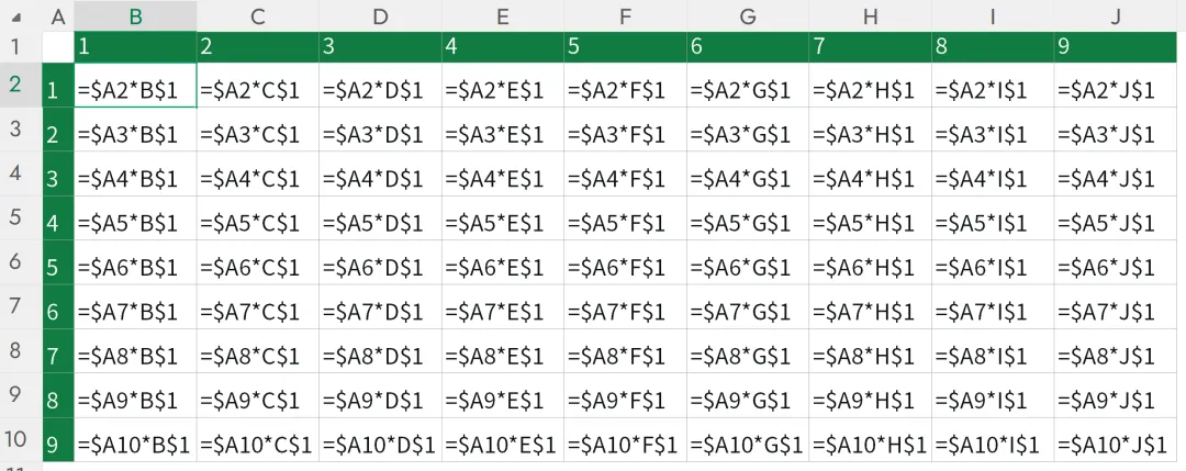 在B2单元格输入=$A2*B$1,再向右和向下填充就可以了!