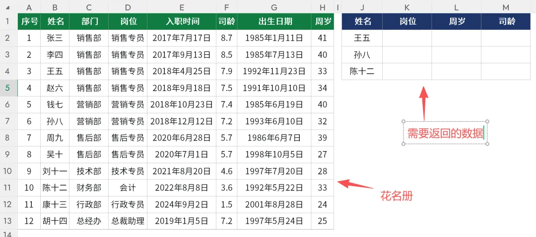 小黄要解决的问题是,要从花名册中,提取多个人的多项信息。写一个公式,向右、向下引用返回全部数据。