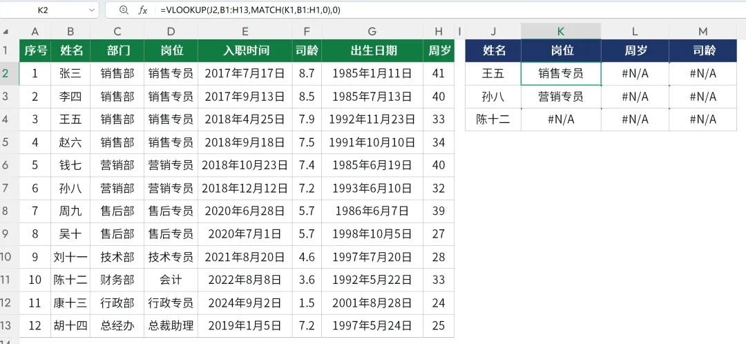 K2单元格中,公式里的第3参数=MATCH(K$1,$B$1:$H$1,0):