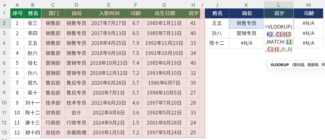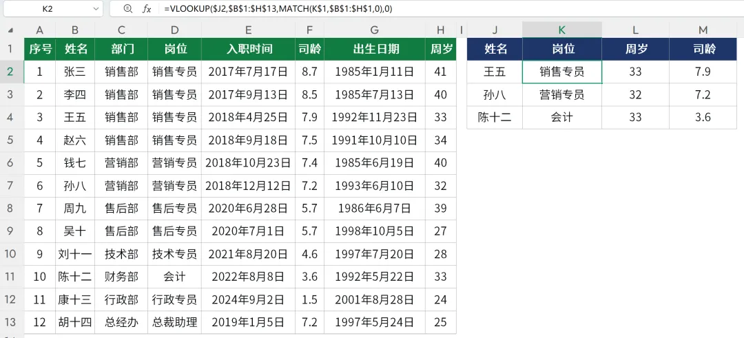 =VLOOKUP(J2,B1:H13,MATCH(K1,B1:H1,0),0),直接向右和向下引用,会疯狂报错。