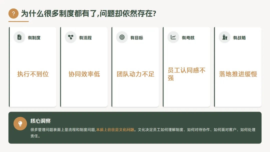 在开始之前,我想先请大家思考一个问题:我们公司各项制度已经很完善了,流程也写得很清楚,绩效考核体系也建立起来了,但为什么在实际工作中,我们还是经常遇到各种各样的问题?