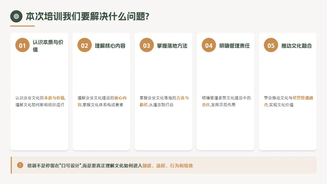 今天的培训我们要解决什么问题呢?我总结了五个核心目标: