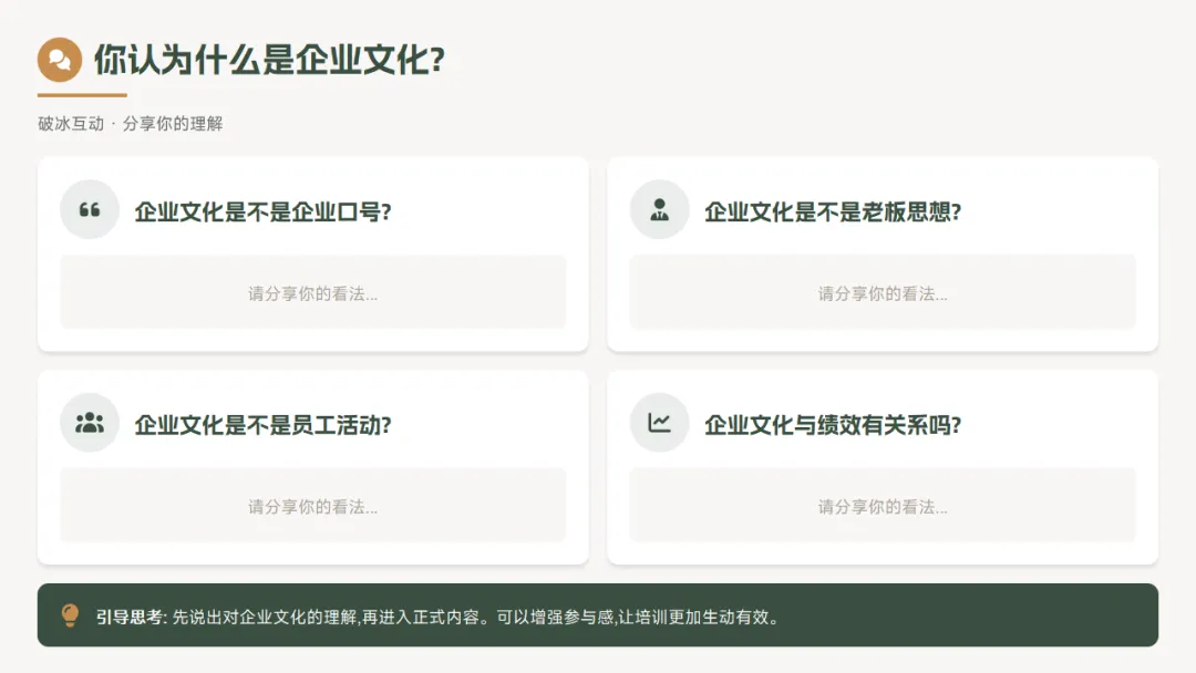 各位可以想想,在我们公司,遇到这些情况时,大家通常是什么反应?这个"通常的反应",就是我们的文化现状。