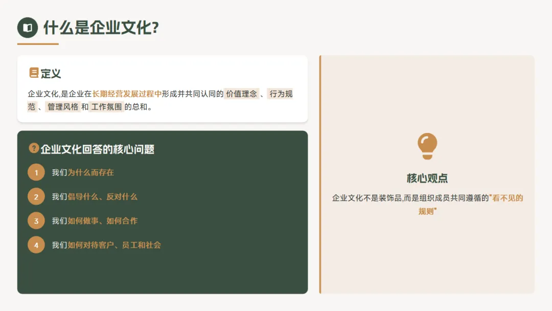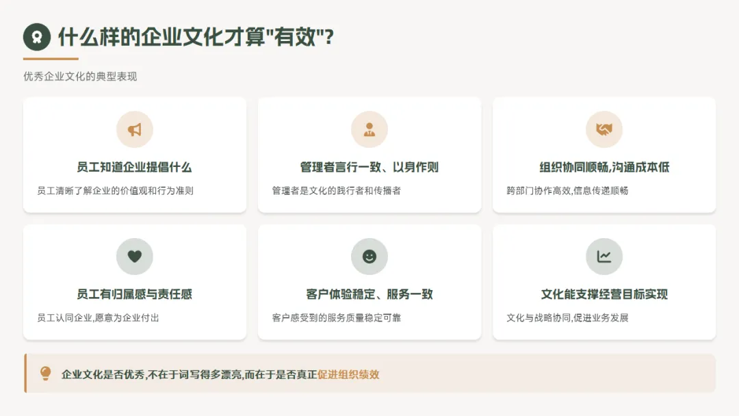 企业文化不是装饰品,不是贴在墙上给别人看的,而是组织成员共同遵循的"看不见的规则"。