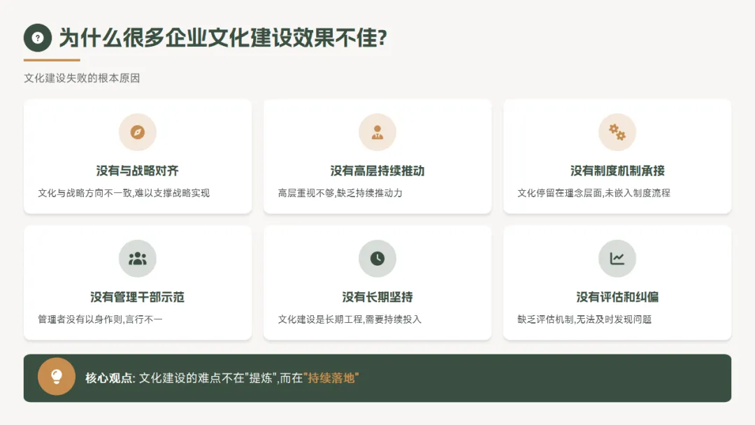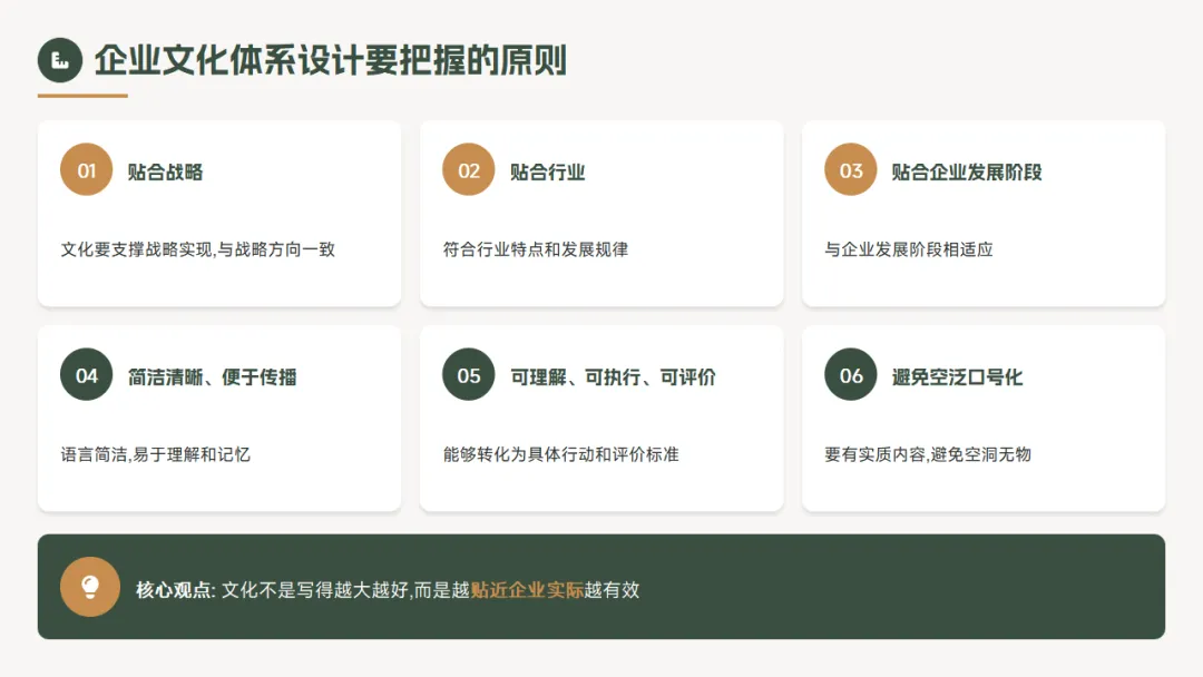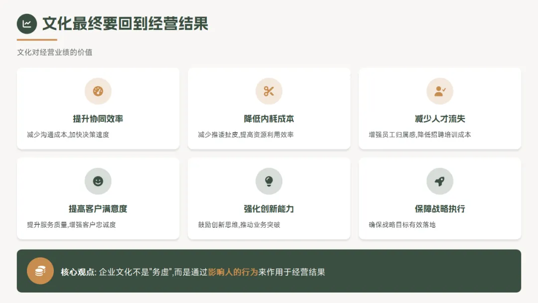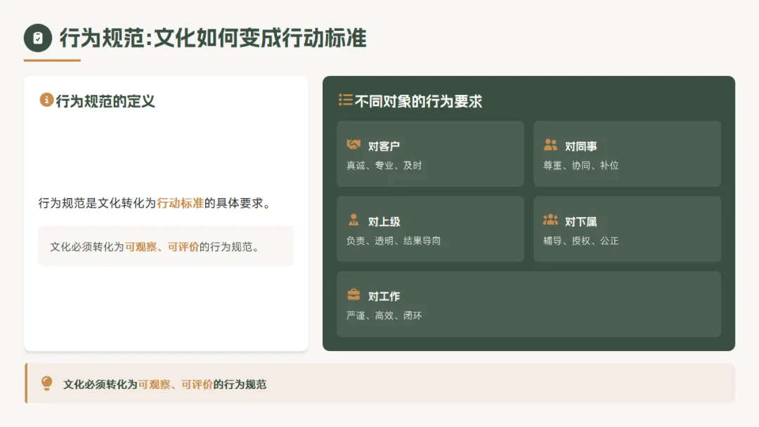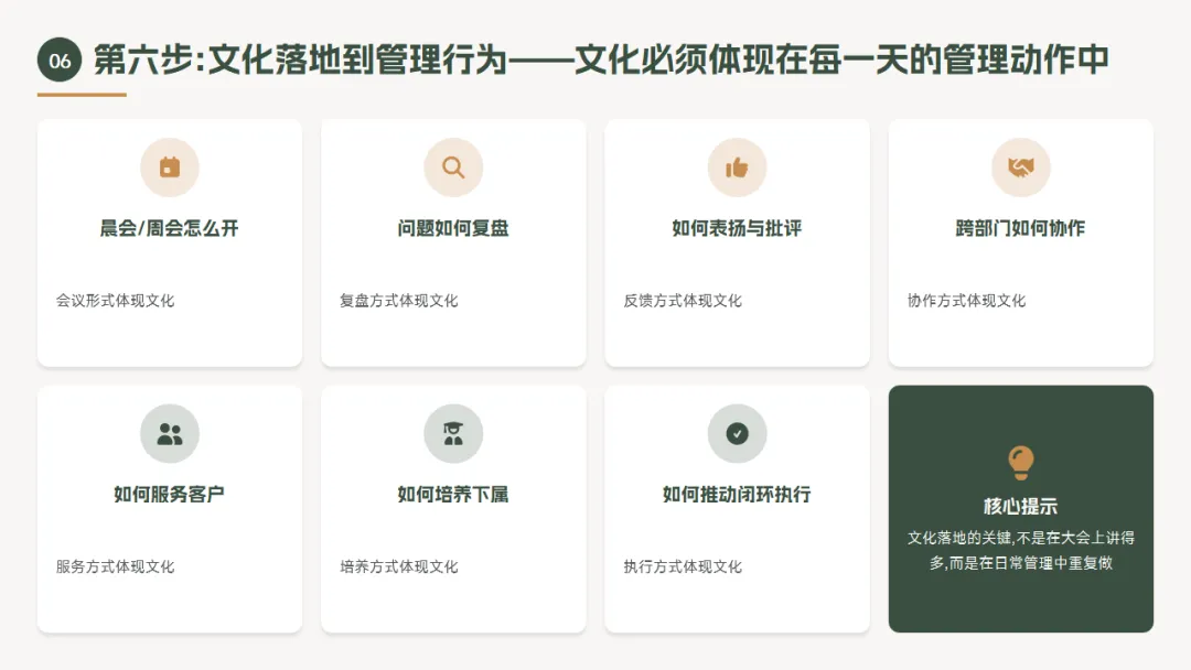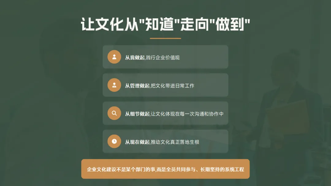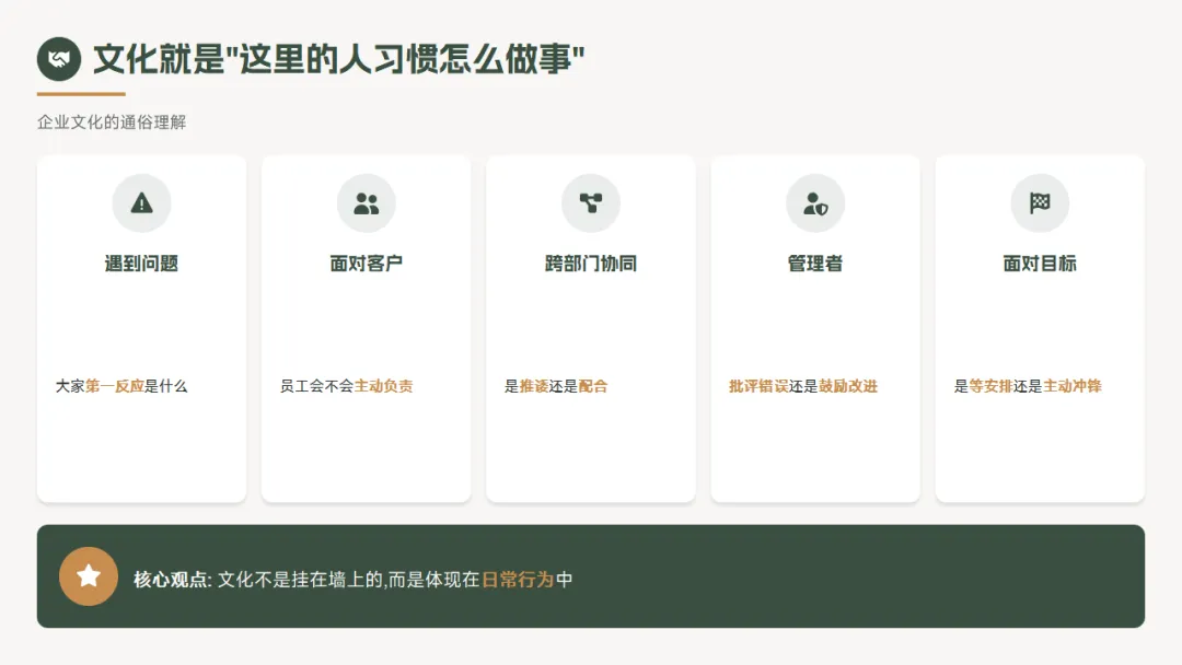 文化不是挂在墙上的,而是体现在日常行为中;不是写在手册里的,而是体现在每一次决策和行动中。