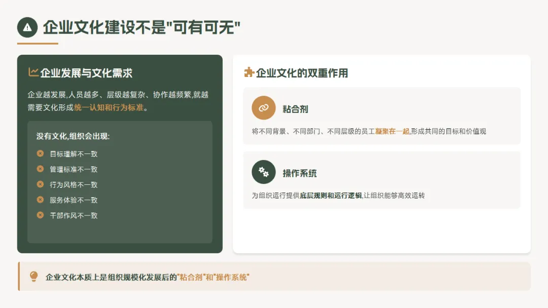 我们要重新认识企业文化的本质与价值,理解文化到底是如何影响组织运行的。很多人一谈文化就觉得是虚的,是口号,今天我们要把它做实。