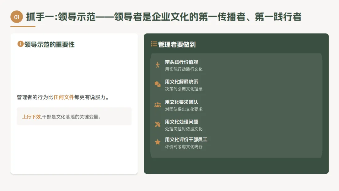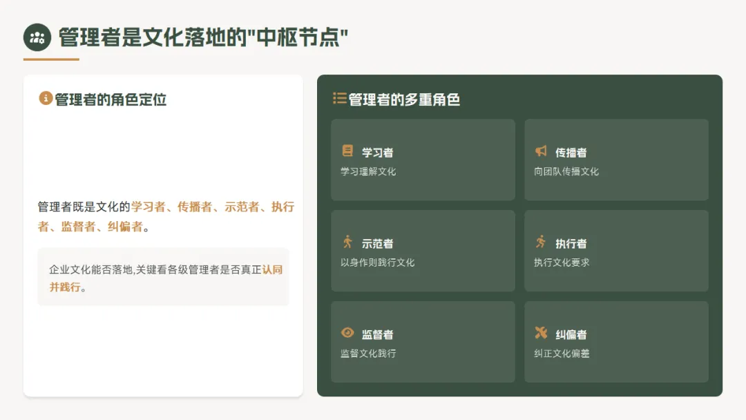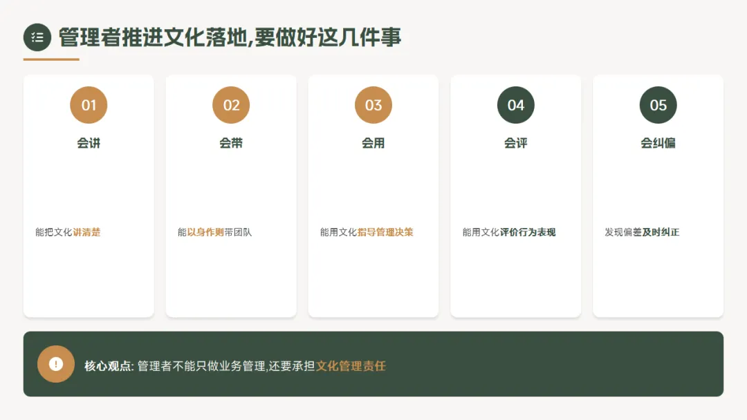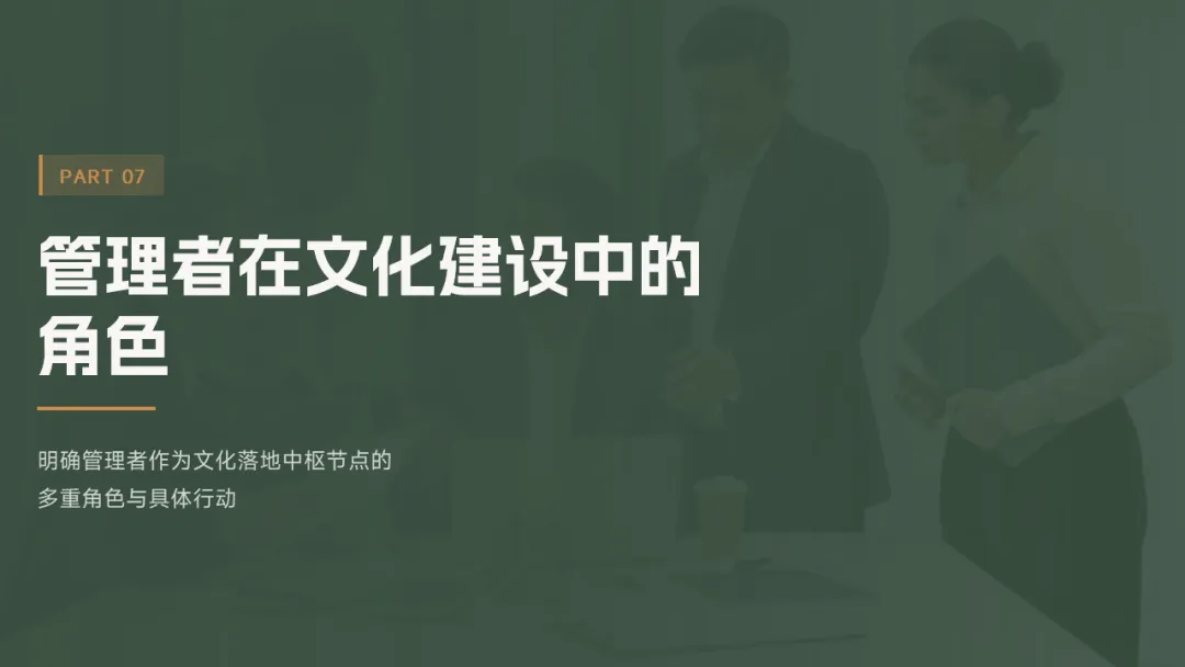 我们要明确各级管理者在文化建设中应该承担什么样的责任,如何发挥示范作用。文化不是HR部门的事,是每一位管理者的事。
