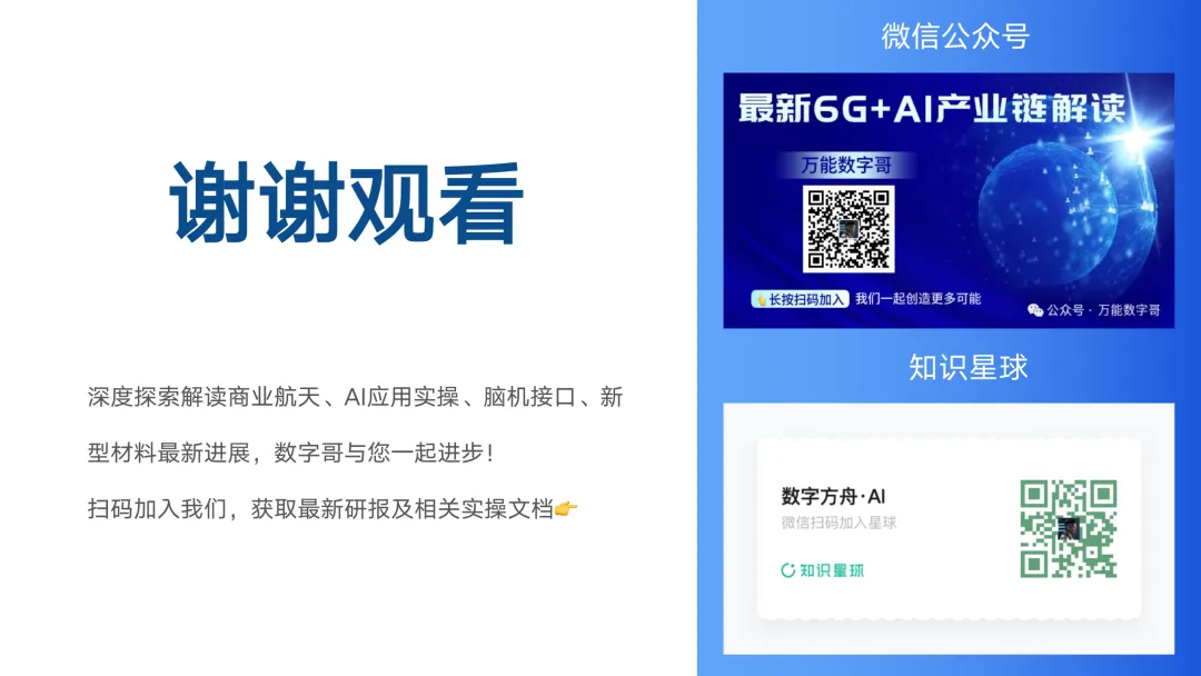 喜欢我们的内容可可以点击♥️推荐哦~您的支持是我创作最大的动力! 更多关于商业航天、6G卫星通信、人工智能、机器人、脑机接口等前沿数字哥亲笔书写PPT、最新进展研报、AI系统性实操课程、行业专业交流社群,均已发布在知识星球,强烈推荐大家加入,同时也欢迎关注数字哥公众号同事加入我们的微信交流讨: