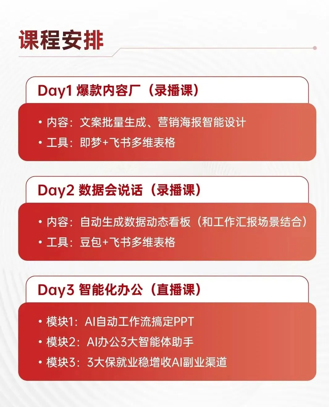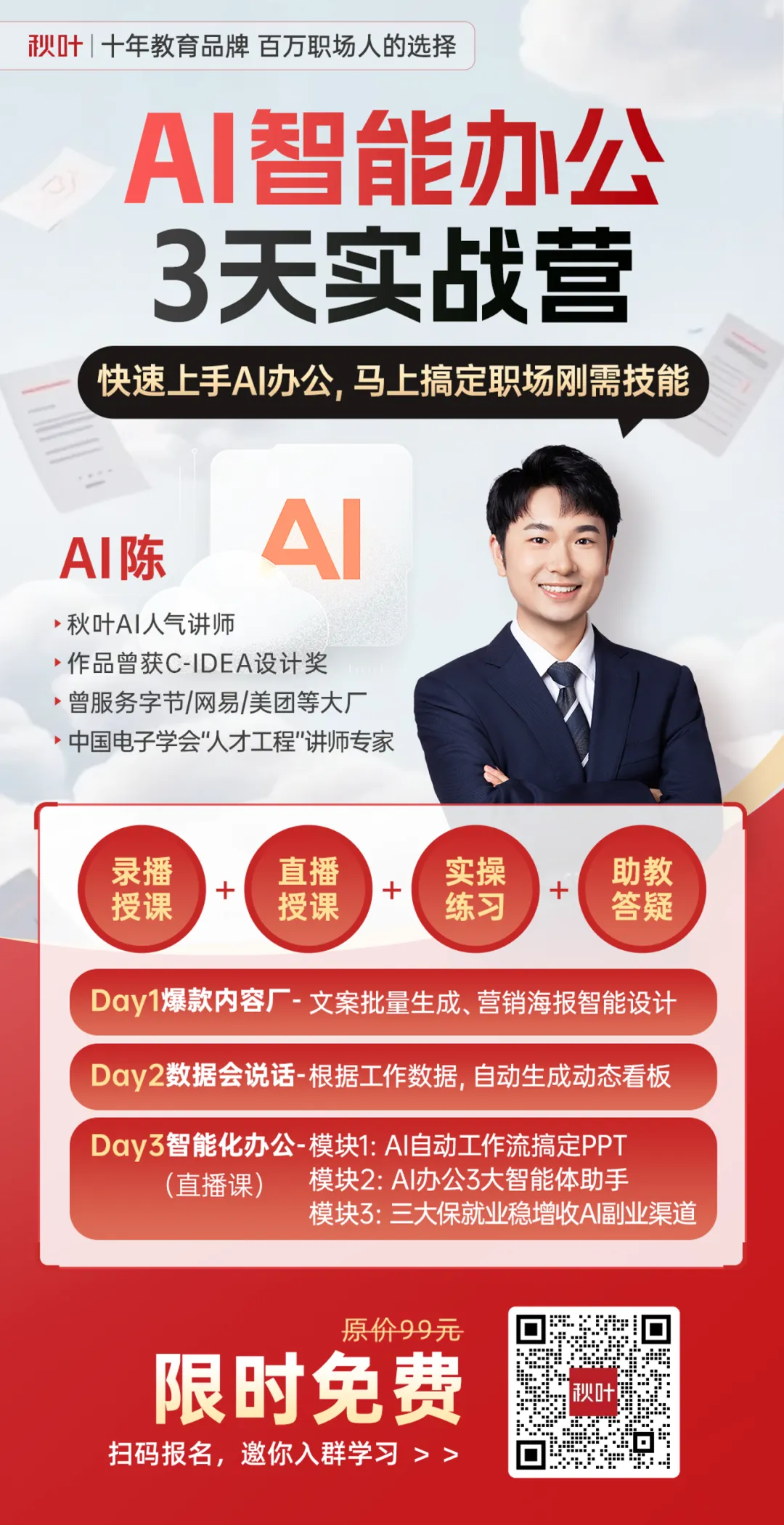 学会使用飞书多维表格、豆包、即梦、Coze,就相当于你同时掌握了工作汇报、数据分析、海报设计、视频制作等多个职场硬技能。而这些工具,在我们的《秋叶 AI 智能办公 3 天实战营》都会讲到,甚至还会教你如何将不同工具组合使用,发挥出 1+1>2 的效果,来看看课程大纲 👇课程讲师 @AI陈 是曾服务字节、搜狐等互联网大厂的实战派导师。他研发的 AI 智能体使用人次已超百万,跟着这种级别的高手学,你能少走弯路,每一分钟学的都是实操干货:别让「不会用 AI」成为你的职场短板 ——AI 时代,掌握它的人,更能抓住工作机遇。如果你想系统学习 AI ,抓住这波红利,那就一定要加入《秋叶 AI 智能办公 3 天实战营》!市面上的 AI 课程非常多,为什么我强烈推荐你和秋叶一起学?我们专注职场教育领域 13 年,已出版 30+ 本 AI 畅销书,尤其是春节期间出版的三本豆包新书,仅 21 天,销量都突破了 100 万册!给各大企业和高校进行的 AI 培训超过两千场,获得众多学员的一致好评:这可不是我瞎说,你去各大招聘软件上搜一下就知道,AI 相关岗位的平均月薪远超市场水平,是当之无愧的风口:不仅如此,学完课程,你甚至还可以利用学到的知识接单做副业,这不比守着死工资强?比如用 AI 批量产出小红书爆款内容,快速涨粉变现:用 AI 设计海报给素材平台供稿变现,下班时间轻松赚外快:如果你想知道AI 变现有哪些具体渠道?具体如何实现?那么欢迎加入《秋叶 AI 智能办公 3 天实战营》!现在报名,还有下面这些 AI 办公实战资料包,你也可以免费领取!🎁 豆包 AI 提示词核心要素、黄金法则、万能公式:包含职业办公、电商、学习教育、金融、自媒体等多个常见场景的高频提示词,拿来就能用。直接套用这些提示词,不去写真店,也能快速拍出大片。别犹豫了!当别人还在观望时,聪明的职场人已经开始行动了。赶紧扫码,加入《秋叶 AI 智能办公 3 天实战营》,快速上手 AI 办公 ↓