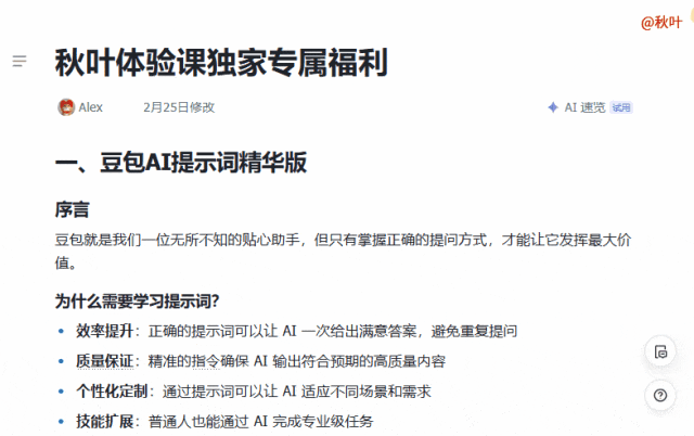 文末免费领取豆包 AI 提示词资料。当你还在死记硬背 Excel 函数公式时,有人已经用 AI 自动写公式,秒出结果:当你还在为复杂的数据管理烦恼时,有人用 AI 搭建业务系统,效率飙升:当你还在为做专业的数据看板抓耳挠腮时,有人用 AI 一键生成可视化仪表盘,轻松搞定汇报:以上所有「神」操作,用飞书多维表格 AI 都可以实现。在就业环境严峻的今天,会用 AI,不仅能让你脱颖而出,比其他人更快找到心仪工作;更能让你保住饭碗、甚至冲击高薪!与其担心被时代抛下,不如主动出击,掌握 AI 时代包括飞书在内的 4 大核心工具(还有豆包、即梦、Coze),真正拉开与同龄人的差距。现在报名《秋叶 AI 智能办公 3 天实战营》,秋叶金牌讲师 @AI陈 会手把手教你实战技巧,帮你用更短的时间玩转 AI、实现职场进阶!看到这里,你可能会好奇,市面上的 AI 工具那么多,为什么秋叶偏偏选择了飞书、豆包、即梦、Coze?答案很简单,因为它们强大、好用、门槛低,是当下职场人的破局利器!豆包,去年春晚火爆出圈,是你的全能 AI 助手,既能写文案、又能 P 图,还可以处理表格、深度分析数据……功能全面强大。即梦,设计小白的救星、高手的加速器。快速制作素材/海报,轻松满足老板需求!比如写短视频脚本,用 Coze 搭建智能体,一键生成固定风格的脚本,大幅提高自媒体账号更新效率。