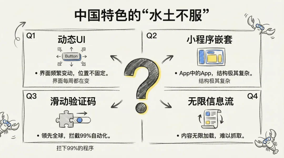 问题具体出在哪里?首先,中文互联网生态下各类超级APP的界面几乎每周都在变,今天还在的按钮明天就换了位置。其次,微信小程序这种“App中的App”,结构极其复杂,传统工具根本无法理解。最让人头疼的是像滑动拼图、点选汉字这类中国特色的验证码,它们能轻松拦下99%的自动化程序。这就是为什么许多看似强大的海外工具,一进入中国市场就立刻‘瘫痪’的核心原因。