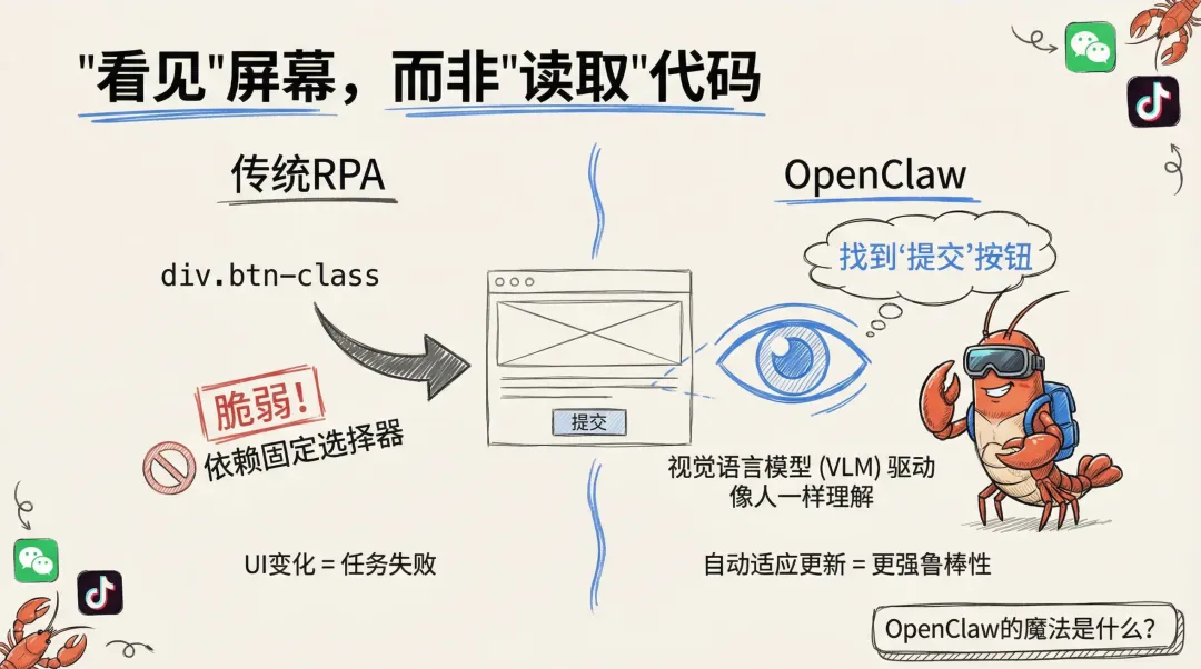 OpenClaw 的魔法究竟是什么?简单来说,它不像传统程序那样需要‘读取’页面的代码结构,而是像我们人类一样,用‘眼睛’去‘看见’屏幕。它利用最先进的视觉语言模型(VLM),能直接理解界面上的按钮、图片和文字的含义。这意味着,就算一个 App 下周更新,把‘登录’按钮从左边换到右边,OpenClaw 也能凭它的视觉‘直觉’找到它,而不需要工程师去修改一行代码。